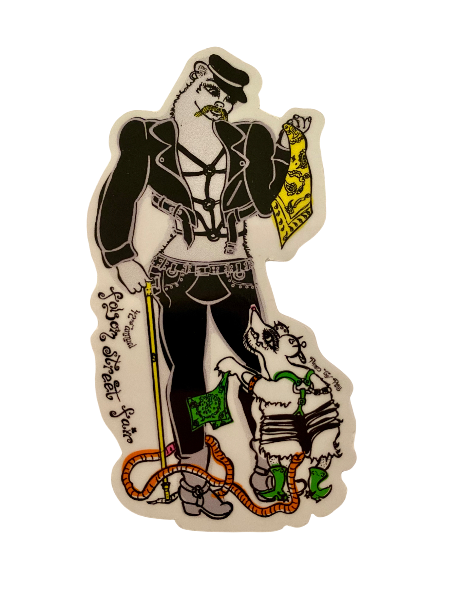 Folsom Street Fair stickers by the artist Poppers the Pony who designed the poster for the 2025 fair.