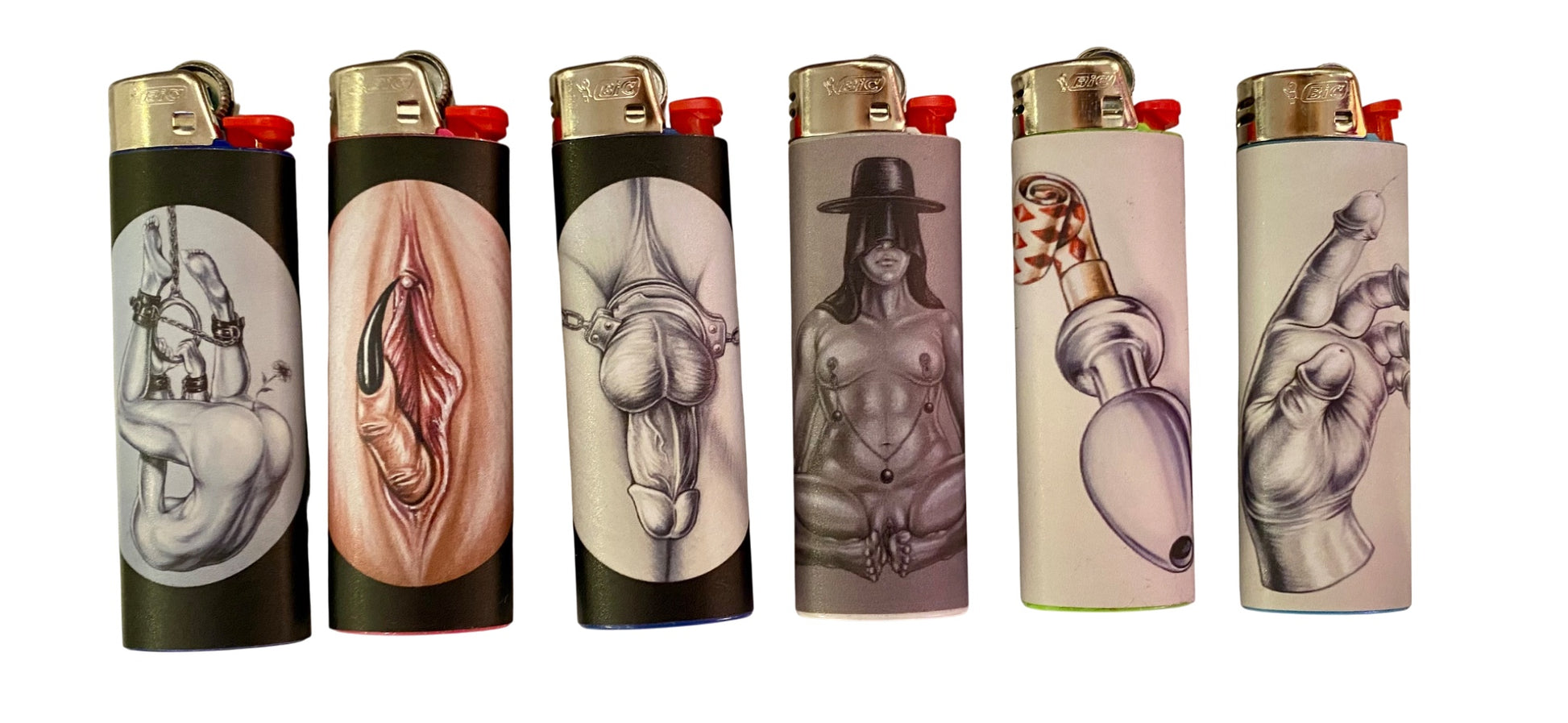 Art but make it FIRE! Rhea Adri original artwork wrapped on authentic BIC lighters. Various designs.