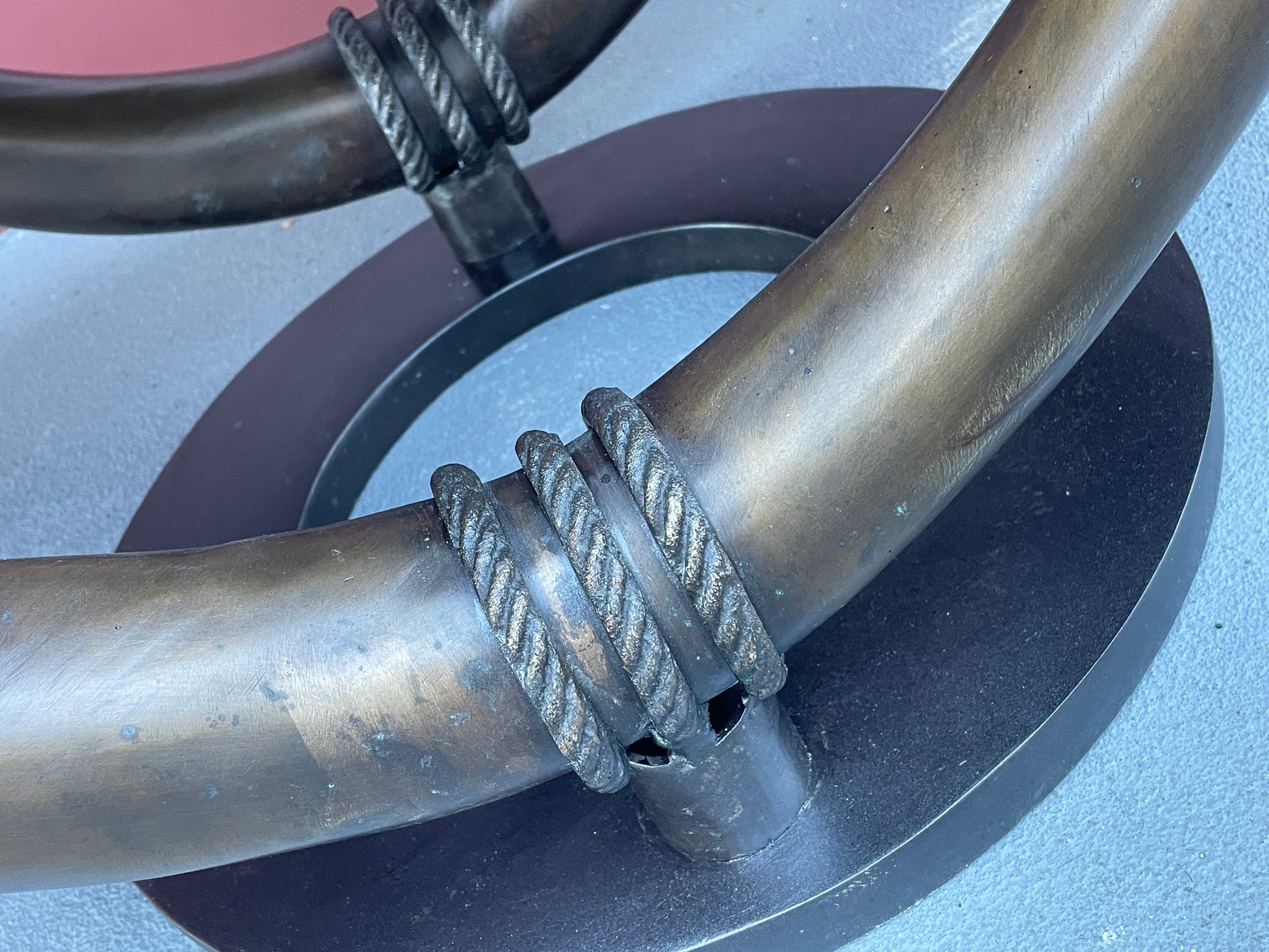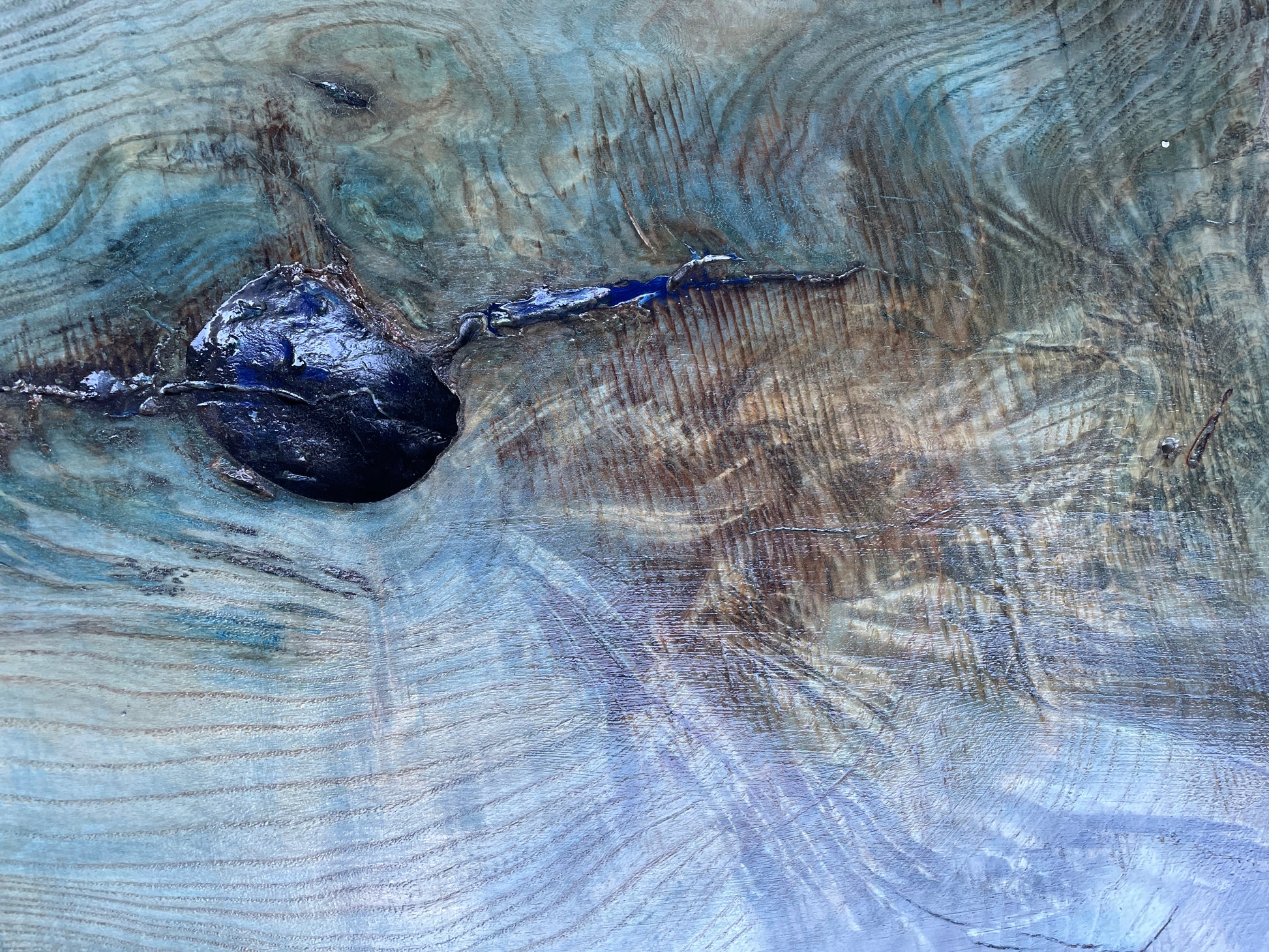 Green ash raw edge coffee table with vintage admiralty bronze base.